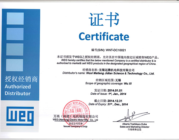 邁騰榮譽(yù)資質(zhì)---2014WEG代理授權(quán)證書(shū)